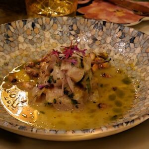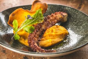 La propuesta culinaria se mueve entre lo mediterráneo y lo italiano, con un enfoque internacional. Entre sus platos más reconocidos figuran los raviolis de ricotta, el pulpo a la brasa, la lubina, los risottos y cortes de carne premium, todos elaborados con técnica precisa y excelente presentación. En el apartado dulce, sus postres completan la experiencia con opciones clásicas bien ejecutadas que mantienen el mismo nivel de calidad.