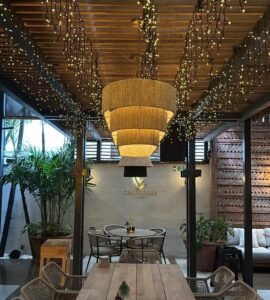 Su estructura destaca por un diseño moderno, espacios amplios y una terraza que aporta frescura y sofisticación al conjunto. La iluminación tenue y el ambiente cuidadosamente curado crean un entorno elegante, ideal tanto para cenas íntimas como para encuentros sociales de alto nivel.